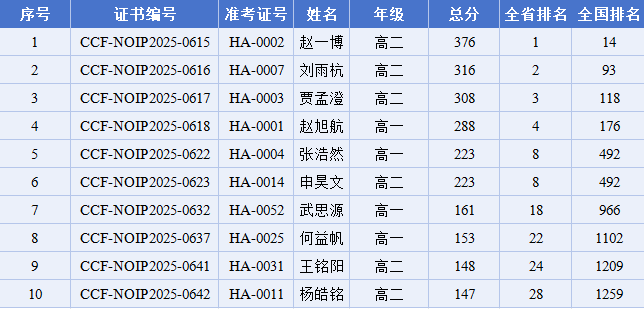 近日,中国计算机学会(CCF)正式公布了2025年全国青少年信息学奥林匹克联赛(NOIP2025)成绩与获奖名单。郑外教育集团学子凭借卓越才智与不懈努力,共有10位同学获得一等奖,一等奖人数位居全省第一。其中前八名选手共6人(我省今年省队男生名额为8人),占全省一半以上,赵一博、刘雨杭、贾孟澄、赵旭航四位同学囊括我省前四名。